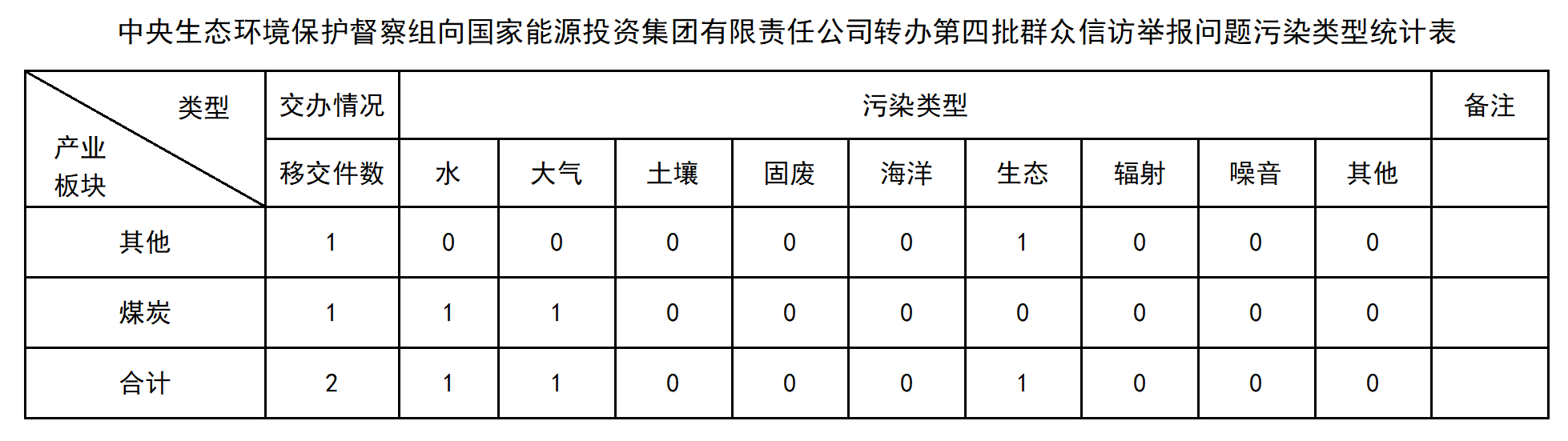 11月24日,中央第五生态环境保护督察组向国家能源投资集团有限责任公司移交第四批群众信访举报件2件,其中来电1件、来信1件。本批信访件涉及生态环境问题3件(一件举报可能涉及多种问题类型),其中水1件、大气1件、生态1件。