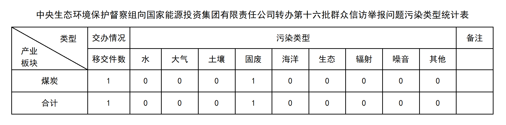 12月15日,中央第五生态环境保护督察组向国家能源投资集团有限责任公司移交第十六批群众信访举报件1件,其中来电1件、来信0件。本批信访件涉及生态环境问题1件,其中固废1件。