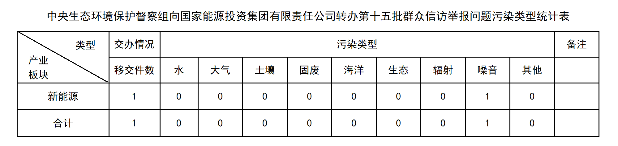 12月14日,中央第五生态环境保护督察组向国家能源投资集团有限责任公司移交第十五批群众信访举报件1件,其中来电0件、来信1件。本批信访件涉及生态环境问题1件,其中噪音1件。