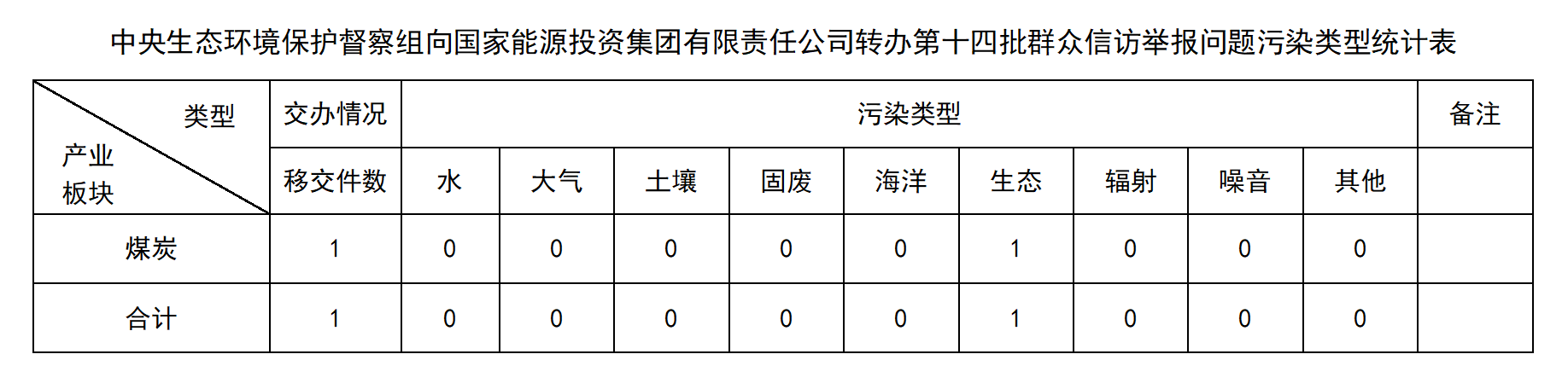 12月10日,中央第五生态环境保护督察组向国家能源投资集团有限责任公司移交第十四批群众信访举报件1件,其中来电1件、来信0件。本批信访件涉及生态环境问题1件,其中生态1件。