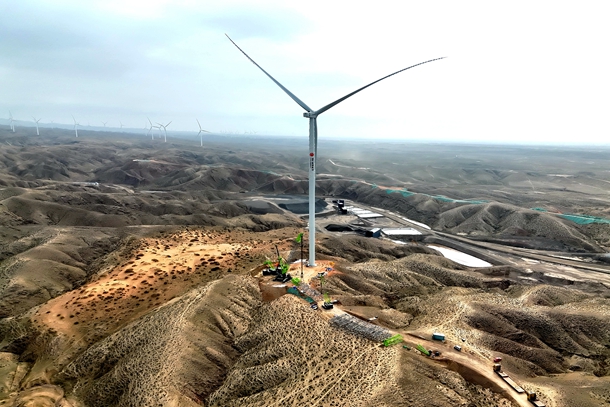 图为红寺堡150万千瓦新能源基地首台风机吊装完成现场
