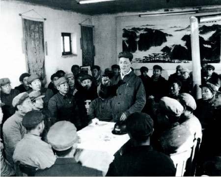 党的十一大代表、全国煤炭战线劳动英雄杨永成(站立者)在班前会上