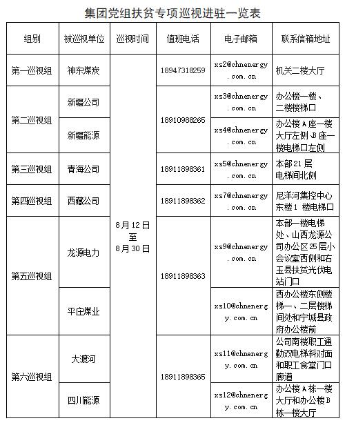 8月12日,茄子视频 党组启动对神东煤炭、新疆能源、新疆公司、青海公司、西藏公司、龙源电力、平庄煤业、大渡河、四川能源等9个单位的扶贫专项巡视,截至8月14日,6个巡视组全部完成进驻。