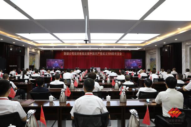 图为新疆公司乌东煤矿党员领导干部在党员活动室收看庆祝中国共产党成立100周年大会