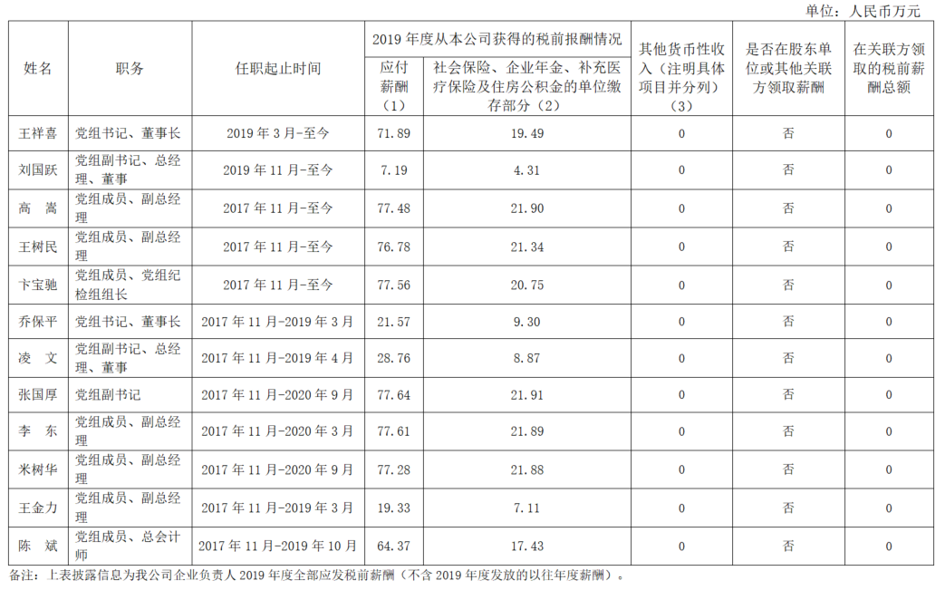 国家能源投资集团有限责任公司企业负责人2019年度薪酬情况