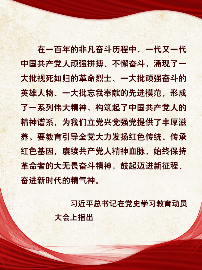 回望奋斗路坚定传承,眺望奋进路使命催征。新征程上,我们会遇到各种可以预见和难以预见的风险挑战,这更需要全体党员从百年党史中汲取精神之“钙”,坚定理想信念,持续提高政治判断力、政治领悟力、政治执行力,自觉在思想上政治上行动上同以习近平同志为核心的党中央保持高度一致,确保拧成一股绳,心往一处想、劲往一处使,为推动中华民族伟大复兴凝聚起磅礴的力量。(文字:徐可 海报:张倩)